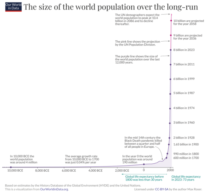 From 10,000 BC to the year 0, the population of humans grew from approximately 4 million to 190 million, for a net change of 186 million people. From year 0 to the beginning of the Eighteenth century, the world added about 410 million people. When The Industrial Revolution hit in full force in the mid-1700s, the population started to explode and quickly doubled in just over 100 years. We crossed the 1 billion mark in 1804 and quickly reached 2 billion by 1928. From there, things got really crazy and today over 8 billion souls are walking this Earth, and that number is growing by about 200,000 people every day.