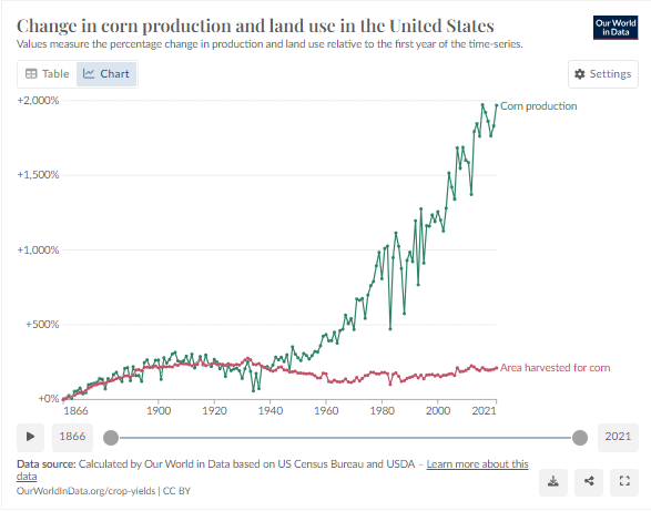 That’s a lot of people to find houses for, feed, and clothe. Early in The Industrial Revolution, economists like Thomas Malthus predicted that the world would be unable to produce enough food to feed the rapidly growing population. Yet somehow food production, which is nearly totally reliant on scarce resources (land and freshwater), has also grown exponentially. Look at the change in US corn production since 1866. It started growing exponentially around 1940 even though the area of land dedicated to corn production was essentially flat over the same time period: