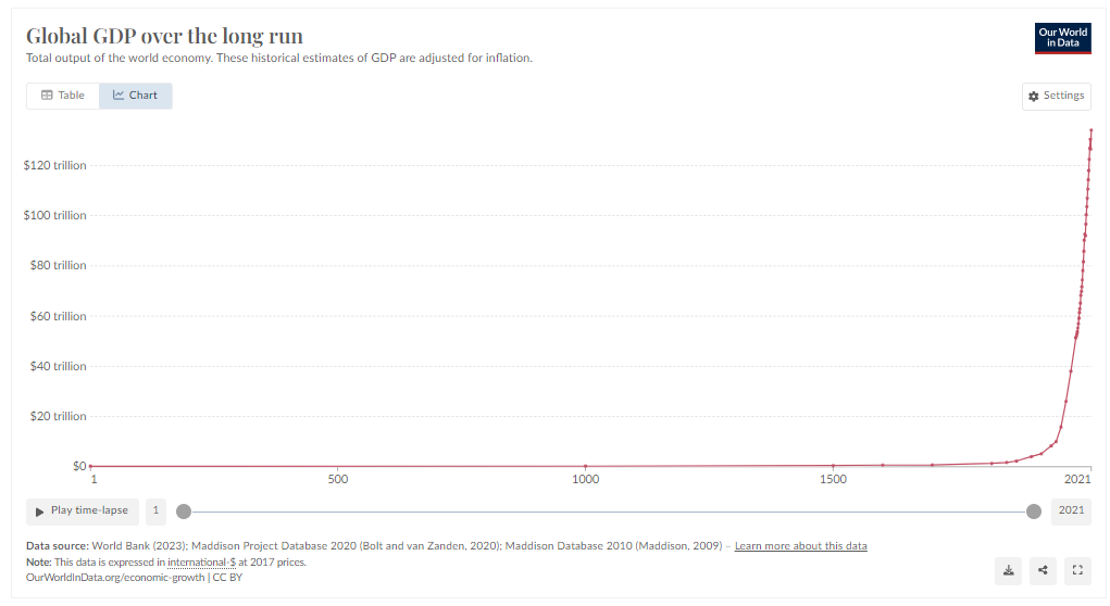 Source: “Data Page: Global GDP over the long run”, part of the following publication: Max Roser, Pablo Arriagada, Joe Hasell, Hannah Ritchie and Esteban Ortiz-Ospina (2023) – “Economic Growth”. Data adapted from World Bank, Bolt and van Zanden, Angus Maddison.