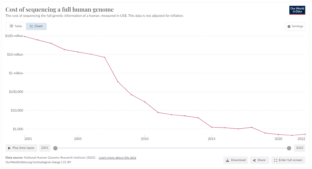 Source: “Data Page: Cost of sequencing a full human genome”, part of the following publication: Max Roser, Hannah Ritchie and Edouard Mathieu (2023) – “Technological Change”. Data adapted from National Human Genome Research Institute.