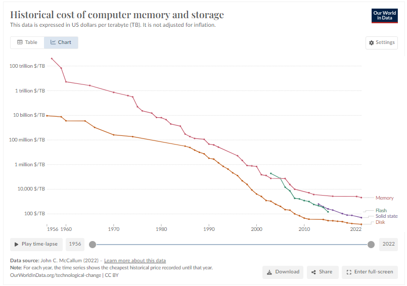 Source: Data Page: “Historical cost of computer memory and storage,” John C. McCallum (2022) – processed by Our World in Data