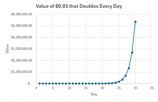 Have you ever heard this old fable: Would you rather get a one-time payment of $1 million today, or instead receive one penny today and that penny doubles in value every day for 30 days? The latter choice is the better option, as your penny will have turned into $5,368,709.12 by the end of day 30.