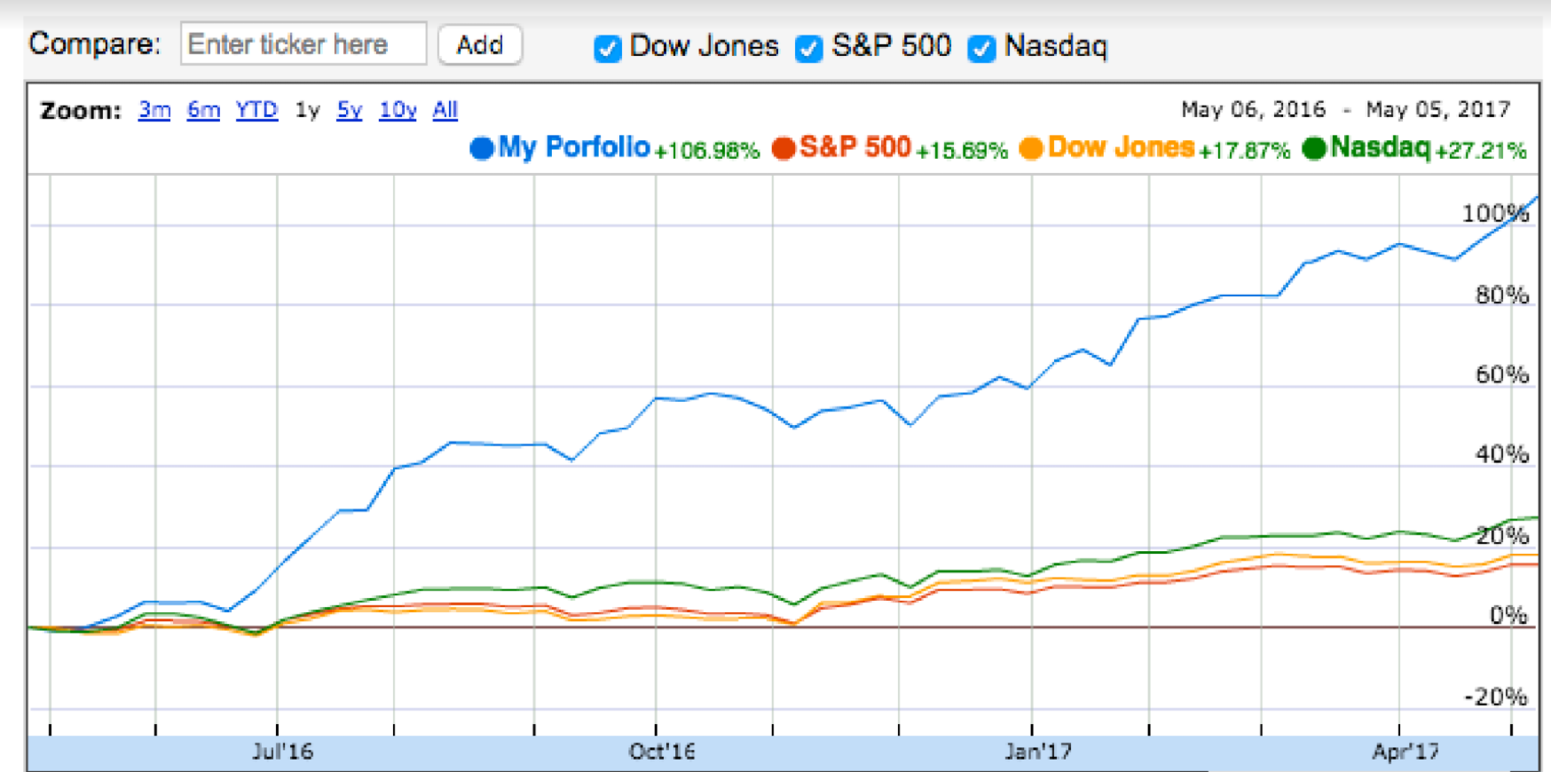 “Trading with Cody is a great way for the busy average person to get insights into investing ideas and the market trends early. Instead of day trading or attempting timing each move against the market, Cody aims to be in the innovative companies early or appropriately. His non-emotional approach to the market and coaching is a very reassuring contrast to the whiplash inducing changing headlines one is otherwise exposed to.” – Ben, May 2017