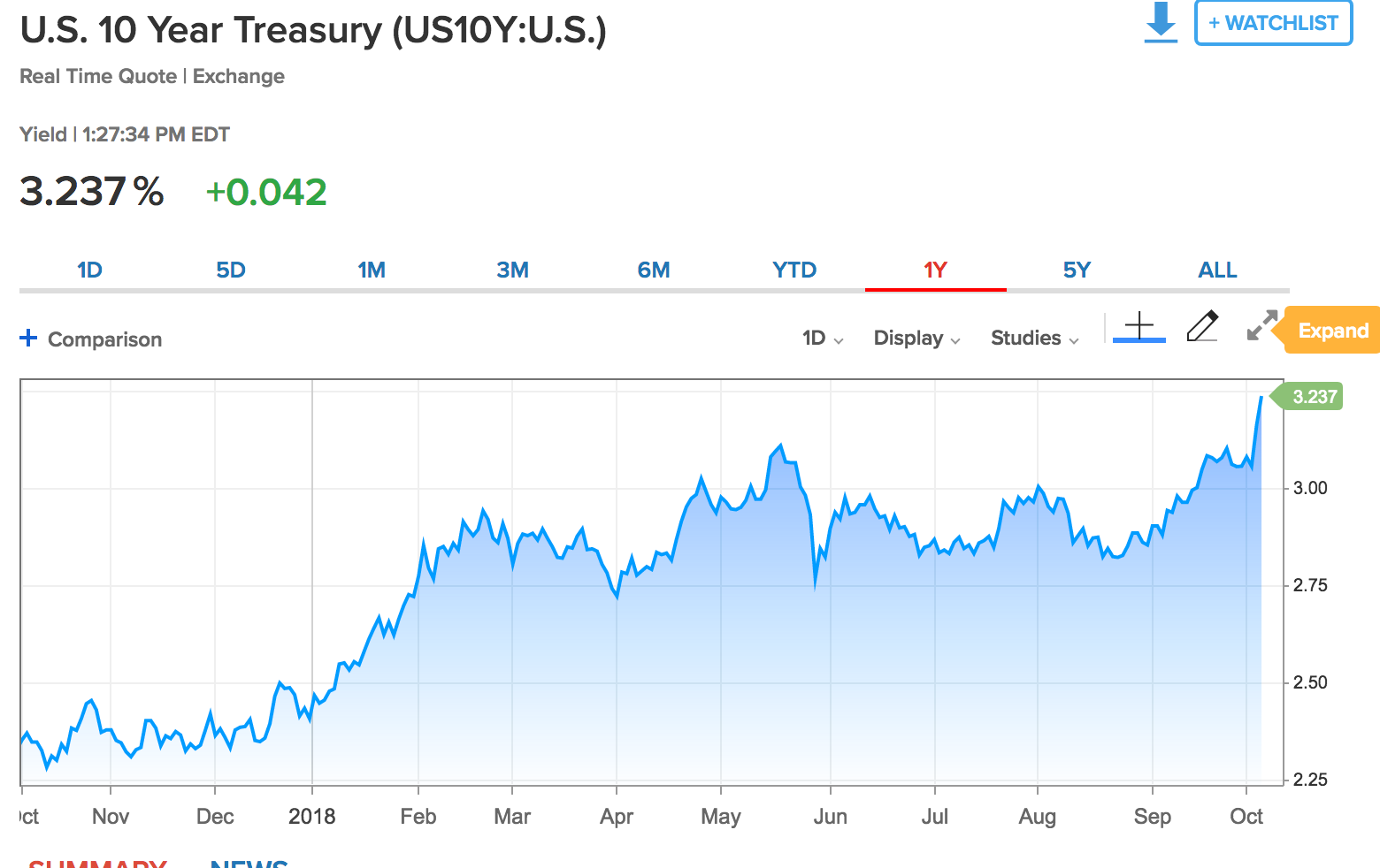 I’ve also noted that its not simply higher rates that would make me concerned about a major pullback in the stock markets, but that it’s when the rates spike higher quickly with velocity. Here’s a chart of the ten-year Treasury: