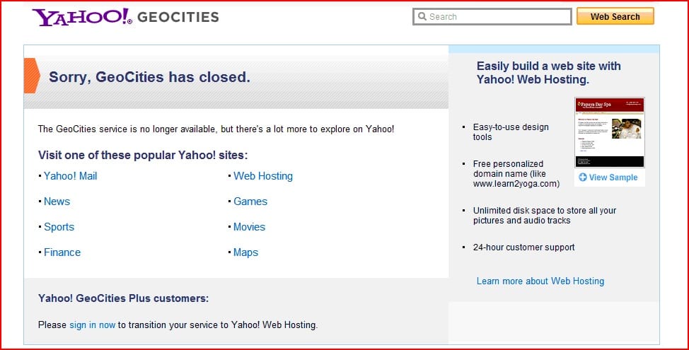 Yahoo’s always good to beat up so let’s start there. If you navigate to Geocities.com today you’ll get this awesome page: