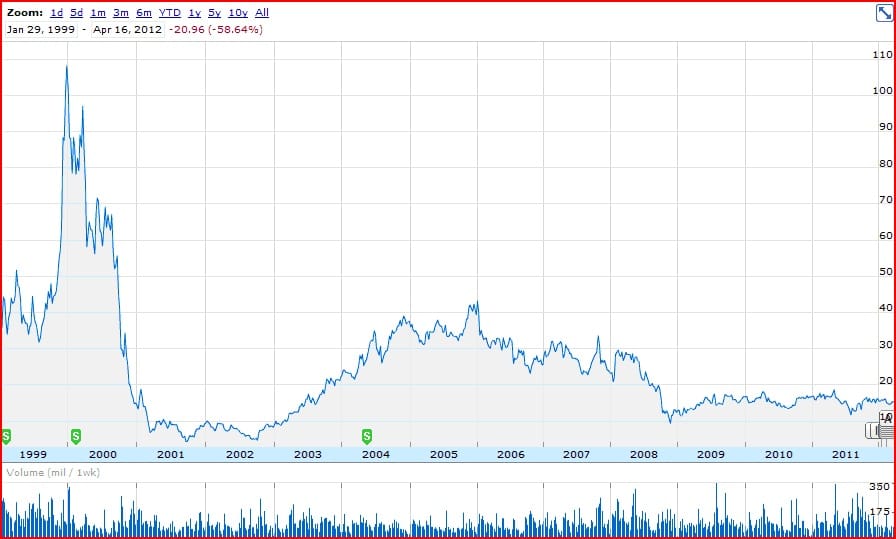 Here’s what Yahoo’s stock has done in the 14 years since the Geocities purchase: