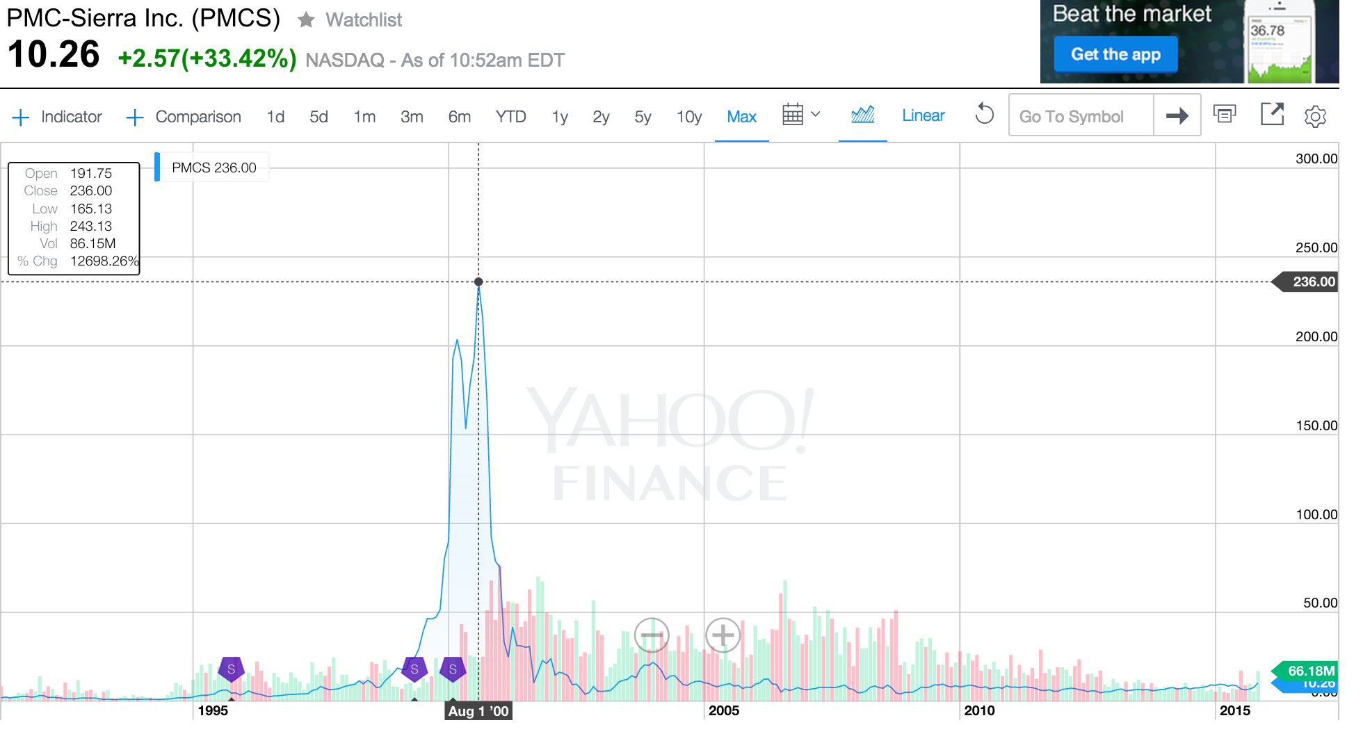 PMCS’s history over the last fifteen years, crashing and never recovering from its year 2000 glory days just might end up “rhyming” with some of biotech’s highest flyers and the future of their stocks.