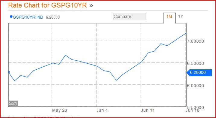 And here’s what the Spanish bonds yields have done in the last month. In case you don’t trade the sovereign debt market, that’s a helluva spike. As you’re reading this, Spain will be going to market for almost $4 billion of shortterm money, and on Thursday they’ll hit up investors for almost $2 billion of long term debt. If investors treat Spain like their debt-to-GDP ratio is 146%, not the official (and fraudulent) 72%, we could be looking at huge swings in the EURUSD back down to 1.23 and a new leg in the end game.