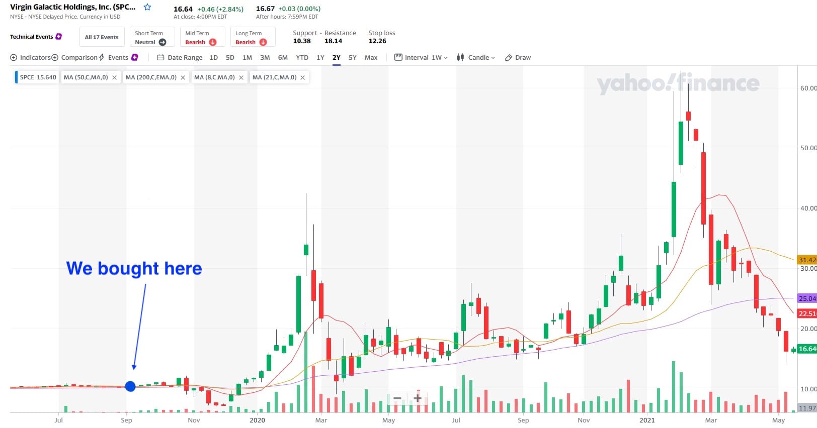 - SPCE Virgin Galactic – This one really stuck out to me and made me really try to find a reason that it is still in the portfolio. I could not find one. On the other hand, the reasons to sell are plenty with constant insider selling, failed test flights, no revenue and just getting left behind in the race to space. I really believe in the potential of the Space Revolution and this one overstayed its welcome in the portfolio because of that. We had quite a wild ride on this one riding it up from $10 to over $60 where I repeatedly suggested taking profits and wished that the company had done a secondary to raise more money. They didn’t. and back down. The stock and the company’s future have probably gone from a virtuous cycle to a vicious one. Hopefully you took advantage of the trade alert in February saying that $57 was a good place to take some profits.