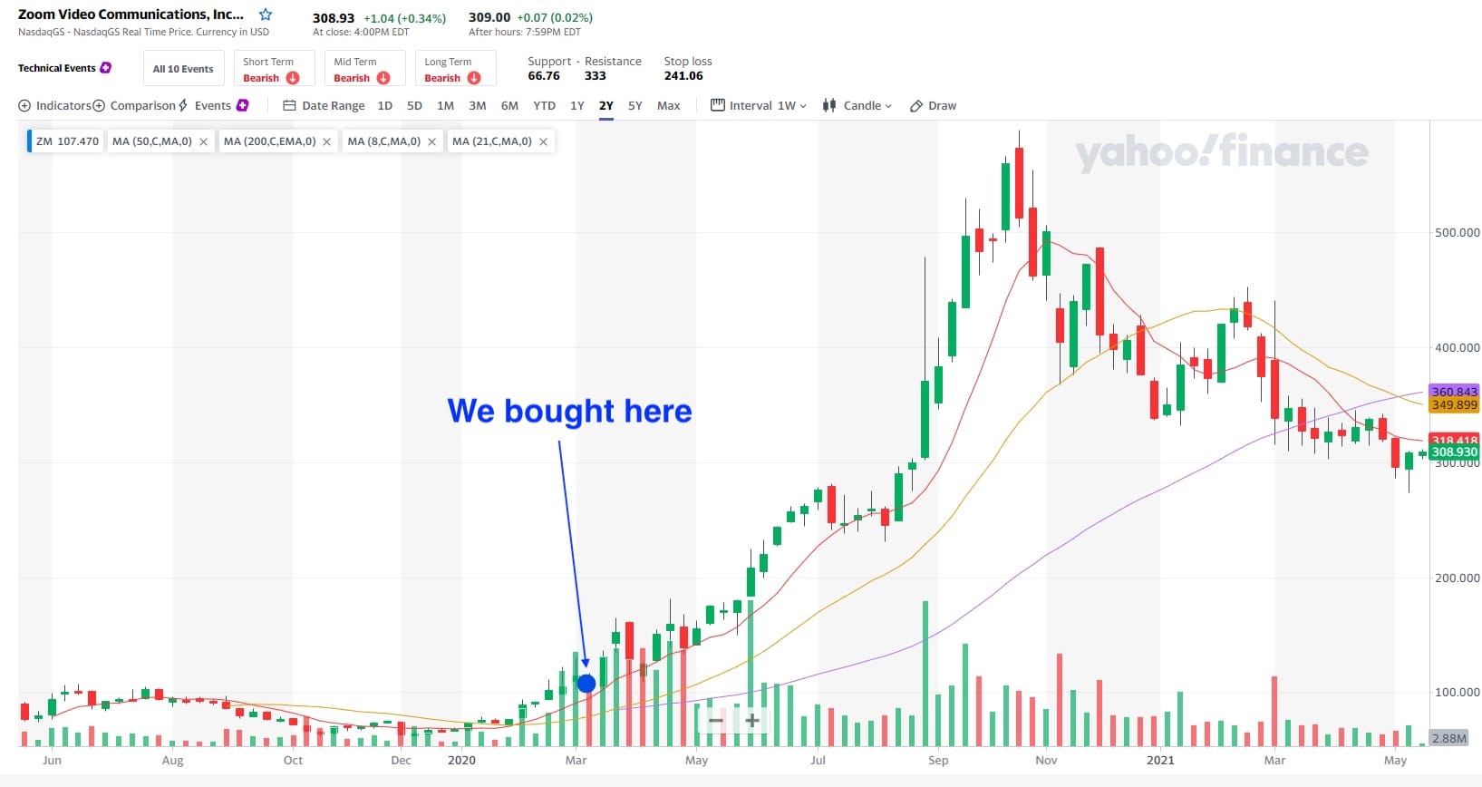 - ZM Zoom – As I have mentioned before, I am not so sure that we as a planet are completely past the Covid-19 pandemic. In fact, even in a post-Coronavirus Crisis world, I do think that the workplace has permanently changed and the future will be more of a hybrid model with more working remotely than we had prior to Covid. But I have a hard time seeing how Zoom will be able to justify its current $100 billion-ish valuation with the increase in competition that I mentioned in the latest Latest Positions. It was a great run over the last fourteen months but I am letting go of ZM.