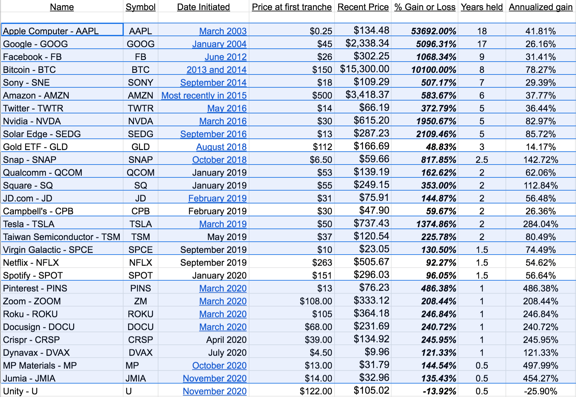 I’m also all about being flexible and opportunistic while trying to protect our capital. We have seven ten-baggers and two dozen or so positions that are up more than double from where we bought them (highlighted below) and I’m feeling torn on what to do with some of the names that haven’t performed for us, and even on some of the names that have winners. And right now, with so many new retail investors in the stock market pool, with just about every asset on the planet having gone vertical in the last year after this long Bubble-Blowing Bull Market, I’m feeling a lot more emotions about my positions and my hedges. Emotions are the enemy to the successful investor and trader. (We haven’t added the Space Stocks to the below spreadsheet yet by the way).