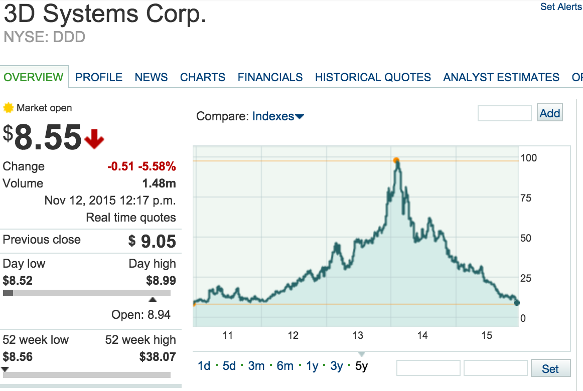 Technology Losers: 3D Systems Corporation – $DDD -5% breaks to near 5-year lows. With this stock down 90% from its highs when it was worth a whopping $10 billion. This is a rare example of a company that could did at least take advantage of their stock being straight up done a 10% secondary offering back when the stock was hockey stick straight up and the company was worth 5x more than its now fully crashed stock status. That said, the company’s cash has dwindled dramatically since that secondary raised more than $300 million for the company as the cash balance on the sheets was down to $150 million as of their last earnings report. And now the stock is back to where it was five years ago before the 3-D Printing Bubble had swept this stock higher. You guys know I’ve been saying that we don’t want to try to catch a bottom in the 3-D printing stocks like $DDD, $SSYS, $XONE or others and that I won’t buy those stocks unless/until we see a couple quarters of strong growth with strong margins. I’m not sure that’ll ever happen though. Avoid.
