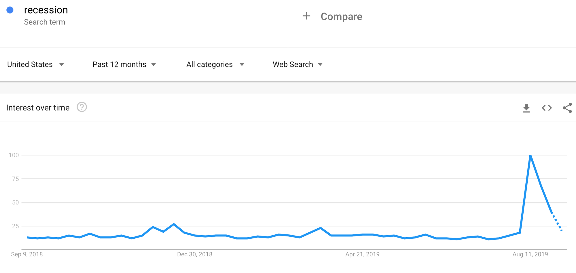 Take a look at this updated chart of people googling “Recession” over the last 12 months, which clearly shows that a strong downward trend, for what it’s worth: