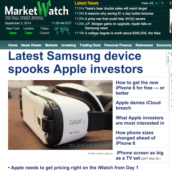 And there’s still too much love for and focus on $AAPL right now, as the cycle plays out as I’d laid out two weeks ago. Headlines on Marketwatch right now: “Latest Samsung device spooks Apple investors. How to get the new iPhone 6 for free — or better. Apple denies iCloud breachWhat Apple investors are most interested in. How phone sizes changed ahead of iPhone 6. iPhone screen as big as a TV set (24/7 Wall St.). Apple needs to get pricing right on the iWatch from Day 1”
