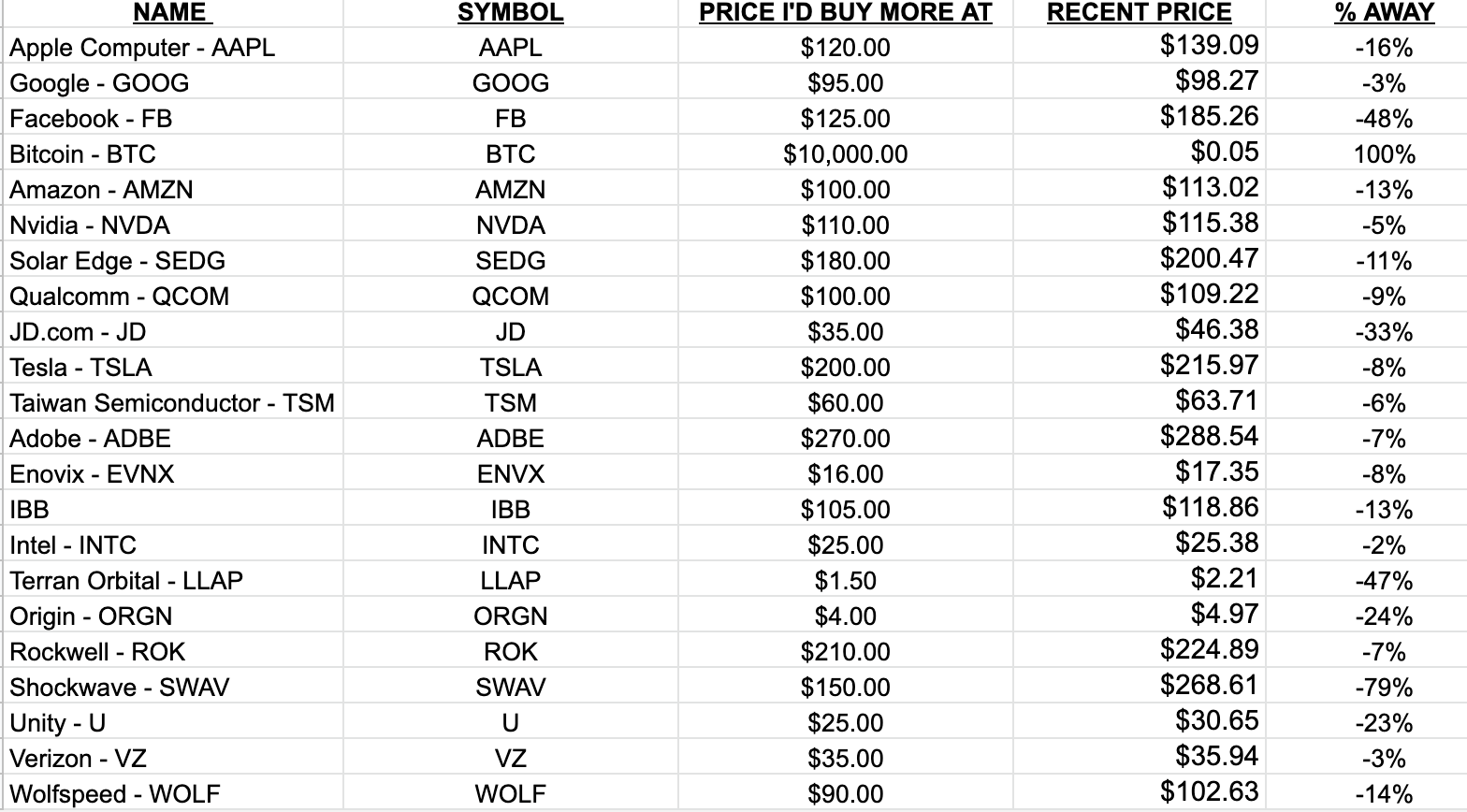 | NAME | SYMBOL | PRICE I’D BUY MORE AT | RECENT PRICE | % AWAY | |