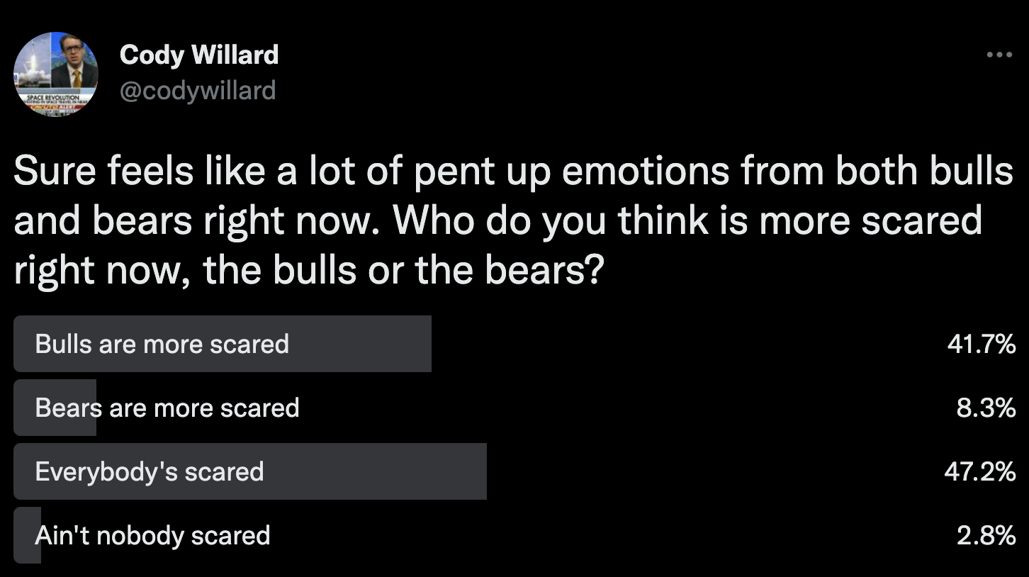 Sure feels like a lot of pent up emotions from both bulls and bears right now. Who do you think is more scared right now, the bulls or the bears? You can post your answer on the twitter poll I just posted by clicking here.