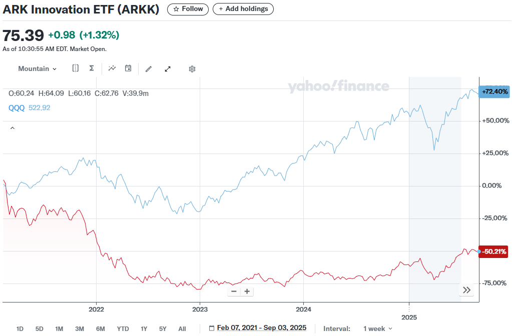 Essentially, our avoidance of overvalued, hyped-up, or scammy companies is one of the primary ways we manage risk. In the long run, we know that the stocks of good companies with growing earnings will perform well, so we aren't really worried about short-term draw downs (we usually buy more!). And while we aren't going to nail every top, by avoiding the sh** companies, we can protect the against massive, permanent drawdowns. Remember, the ARK Innovation Fund (ARKK) is still down 50% from its all time high while the QQQ is up about 73% since then:
